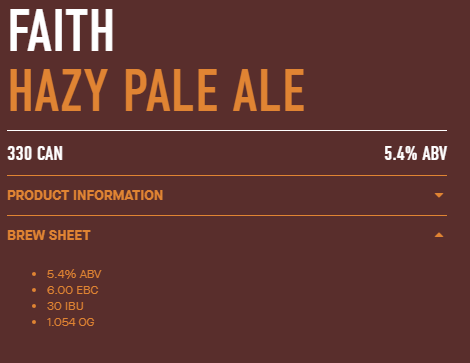 Ok, another go at this one! My first version (brew 52) was a little too bitter. My second attempt – the Extra Flavour version MK1 (brew 60)- succeeded with more flavour (bittering hops reduced and a hopstand with increased hops at a lower temperature). There was no cold crash or irish moss , but this resulted in too much sediment in the bottles. The third version (brew 63) – Extra Flavour version MK2 – had the bittering turned down even more, but was cold crashed and protafloc (similar to irish moss) added. Very drinkable, but, on reflection, nothing like Faith at all! So it is back to the drawing board on this one!