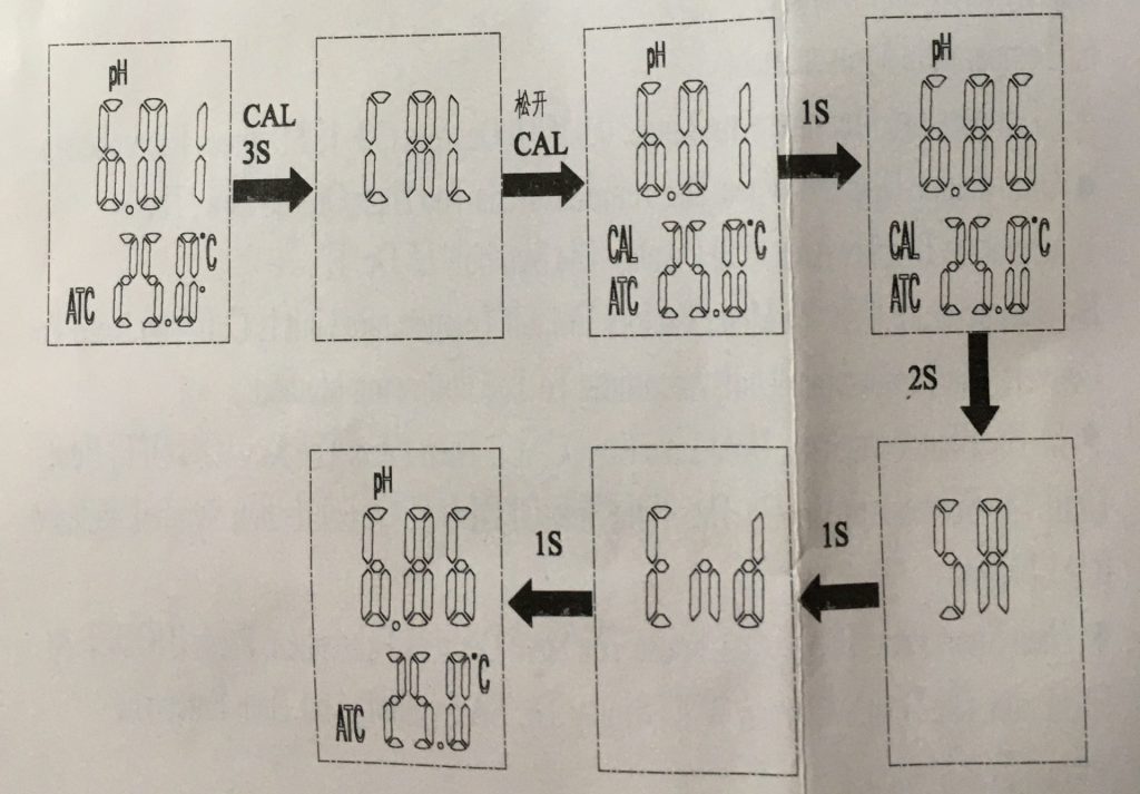 - Put the probe into the 6.86 solution and hold the “CAL” button down for around 3 seconds. This starts the calibration process. The display then displays “CAL”, then 1 second later it shows the current PH, then 1 second after that it sets the current PH to be equal to 6.86. Then it displays “SA” for 1 second and then it displays “End” for another second. Then the meter goes back to displaying the current PH (which is 6.86)