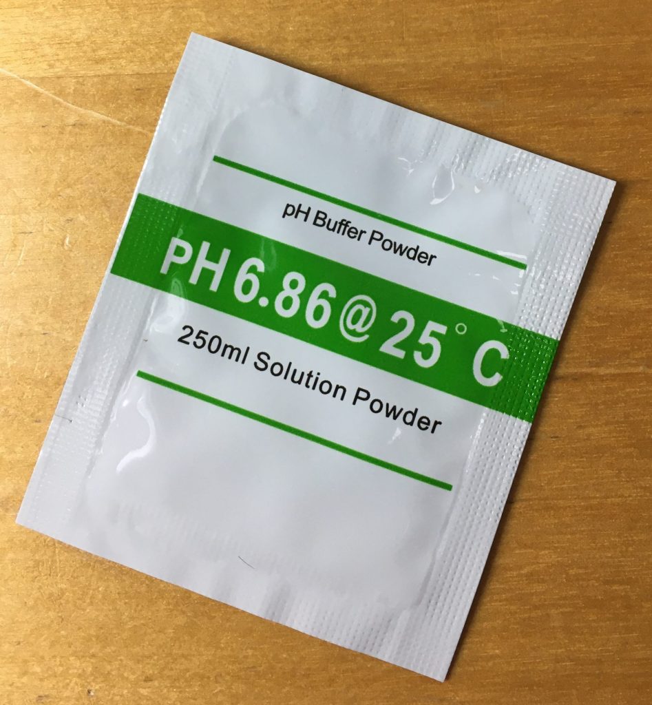 - You need to acquire some test solution that has a specific PH of 6.86. Fortunately, these solutions have been standardised and you can buy small sachets of powder that you mixed with 250ml of distilled water to get a 6.86 solution (+/- 0.01 PH). Once made up the solution is good for a couple of months if kept in an airtight jar. I found the sachets on Amazon. Some versions of this PH meter seem to come with some of these sachets in the box.