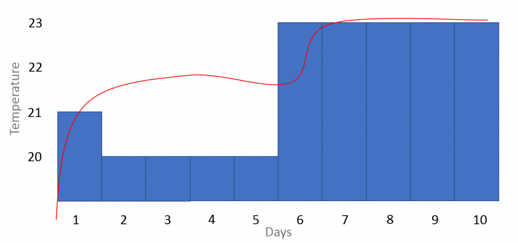 - After the initial 24 hours at 21C, the temperature drops to 20C for 4 days. In fact, I don’t tend to cool the fermentation tank – I just leave it do it’s thing! Often the tank will reach around 22C. Why does this happen if the tank is set to 20C? This is due to the yeast generating heat during fermentation.
